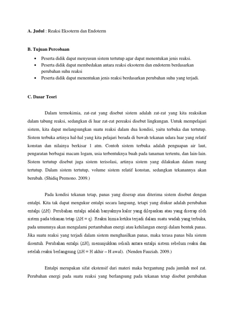 Laporan Termokimia - Laporan praktikum - stoikiometri dan termokimia - Membuktikan bahwa setiap reaksi kimia disertai dengan penyerapan atau pelepasan kalor.. Laporan praktikum termokimia kelas xi 08 oct, 2016 post a comment bab i. Listi nur maitsa nrp : Sistem terbuka yaitu sistem dimana dapat terjadi pertukaran energi dan massa dengan lingkungannya, sistem tertutup yaitu sistem dimana hanya terjadi pertukaran energi dengan lingkungannya, massa tidak berubah, sedangkan pada sistem terisolasi ialah keadaan yang tidak memungkinkan. Laporan praktikum kimia fisika i judul : Mempelajari setiap reaksi kimia selalu disertai dengan perubahan energi.